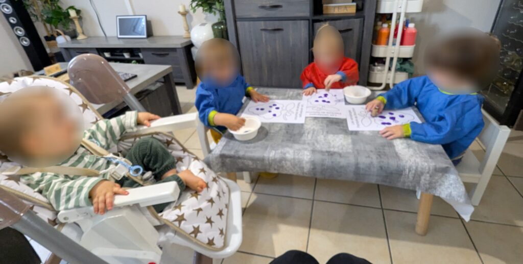 Septembre est le mois des vendanges, alors c’est parti. Pour les plus grands, ils ont fait des tampons avec un bouchon pour réaliser les grains de raisin. Et oui tant qu’à faire un bouchon de vin. Jules, lui s’est servi de ses doigts.