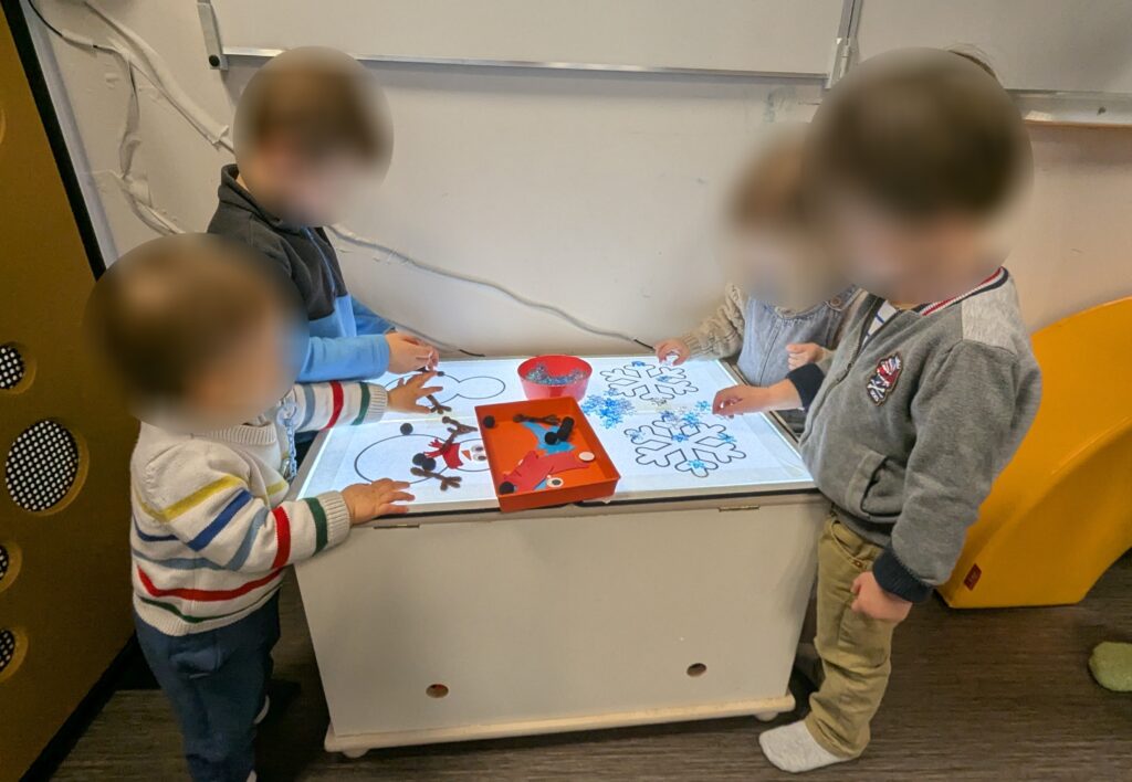 La tablette lumineuse a également rencontré un grand succès. À partir d’une silhouette de bonhomme de neige, les enfants ont pu reconstituer, inventer et imaginer librement à l’aide de flocons lumineux. Un moment propice à la concentration, à la créativité et à l’exploration visuelle.