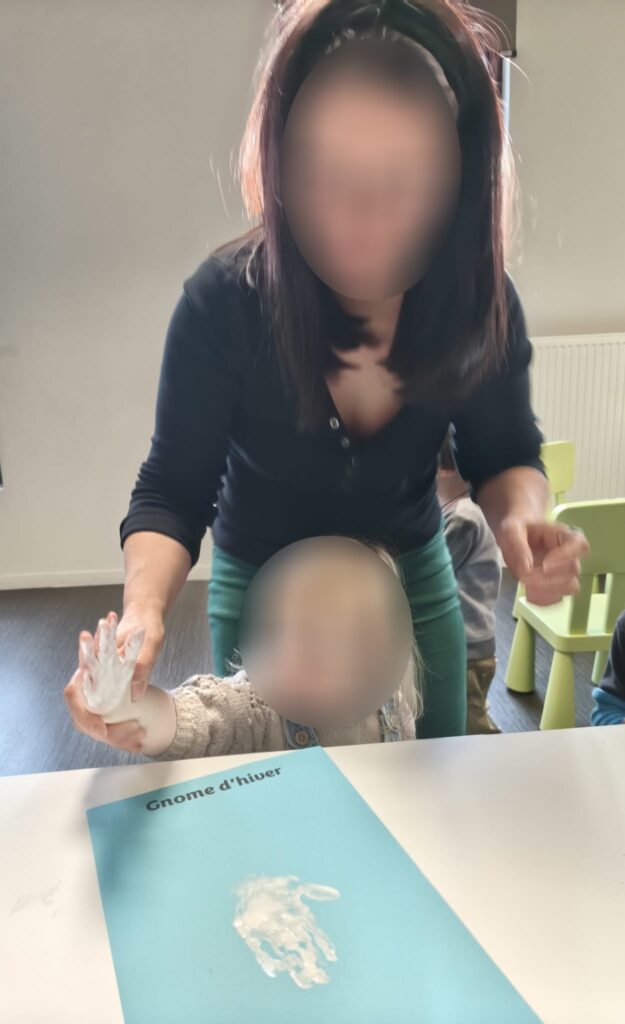 Place ensuite à la créativité avec une activité d’empreinte de main transformée en petit gnome d’hiver. La peinture blanche sur la main a suscité des rires et quelques chatouilles, tout en permettant aux enfants de découvrir les sensations, de s’exprimer librement et de laisser une trace personnelle de cette matinée