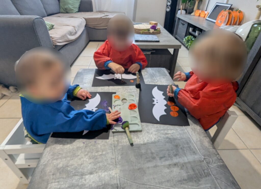 Sur une grande feuille noire, une chauve-souris découpée a été posé avec soin. Puis, munis de pinceaux tampons ronds, les petites mains se sont mises à tapoter tout autour, en faisant apparaître un joli ciel plein de nuances.