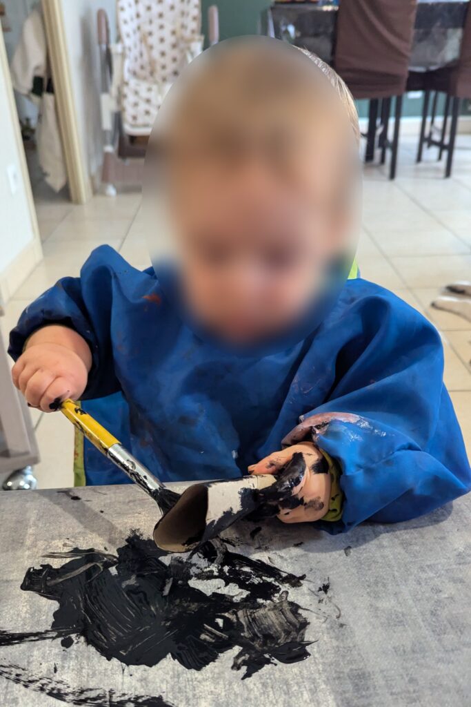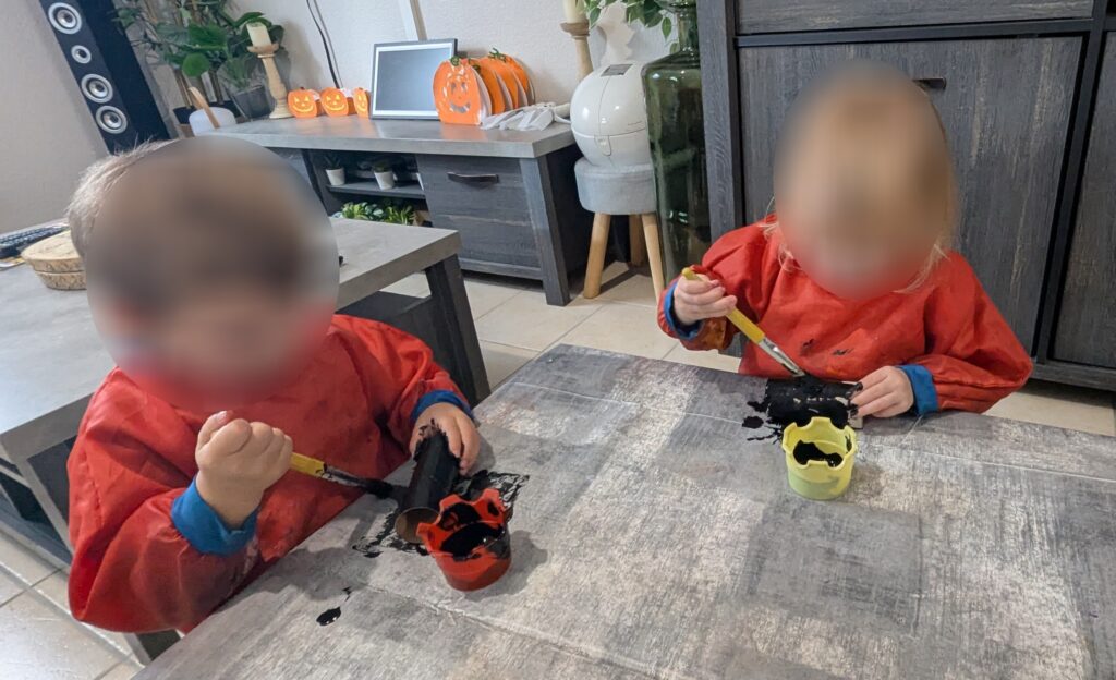 Les enfants ont d’abord peint en noir leur rouleau de papier toilette, concentrés et ravis de transformer ce simple petit cylindre en drôle de bête. Une fois la peinture sèche, j’ai découpé avec eux les pattes, puis on a collé de grands yeux curieux… et voilà qu’une belle araignée est apparue !