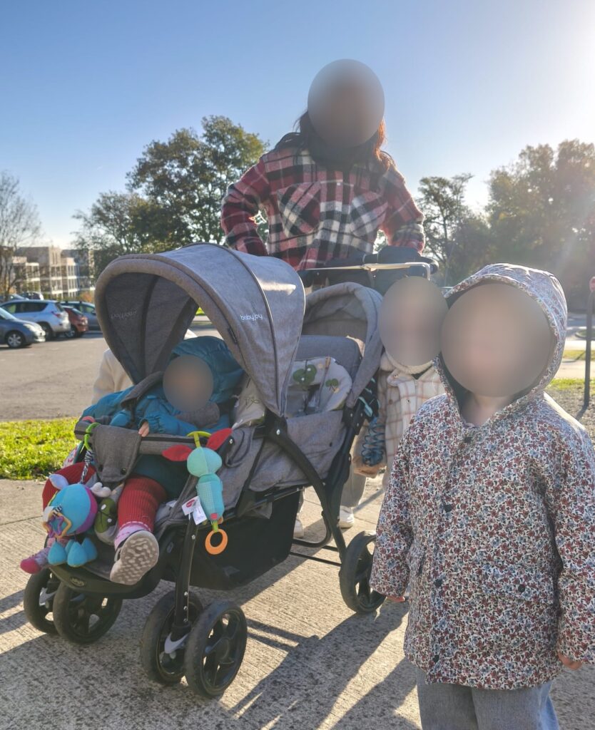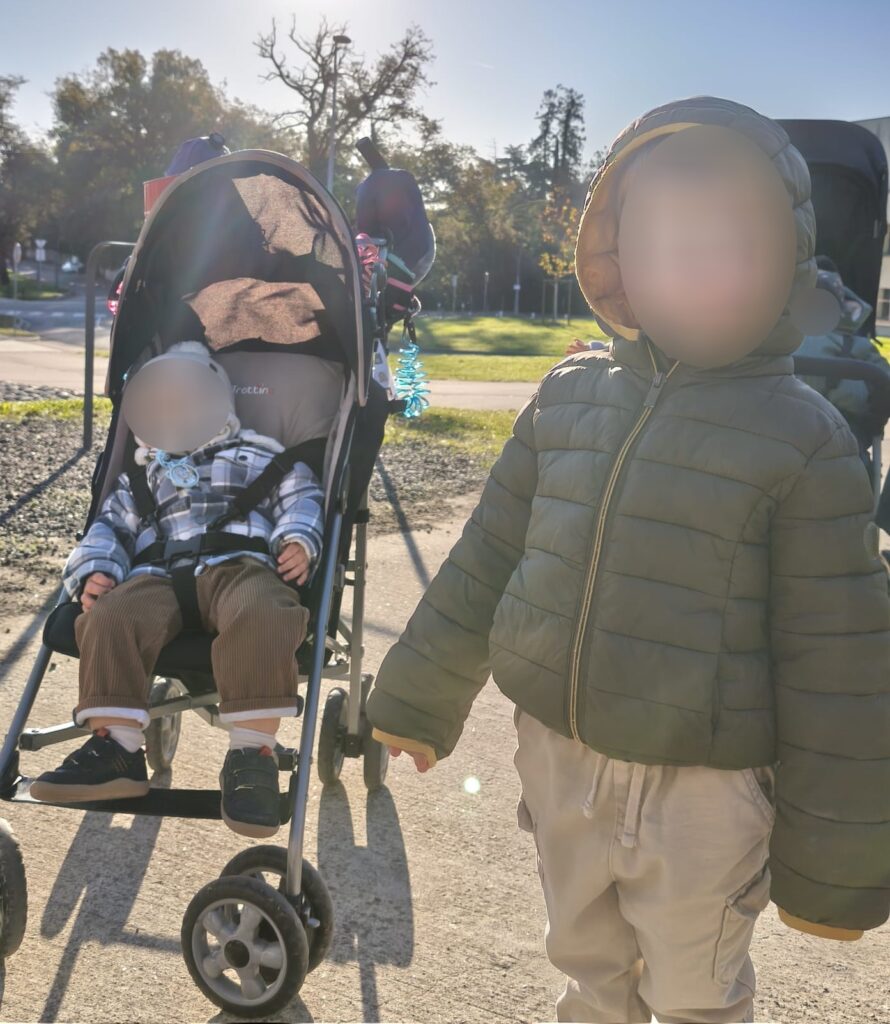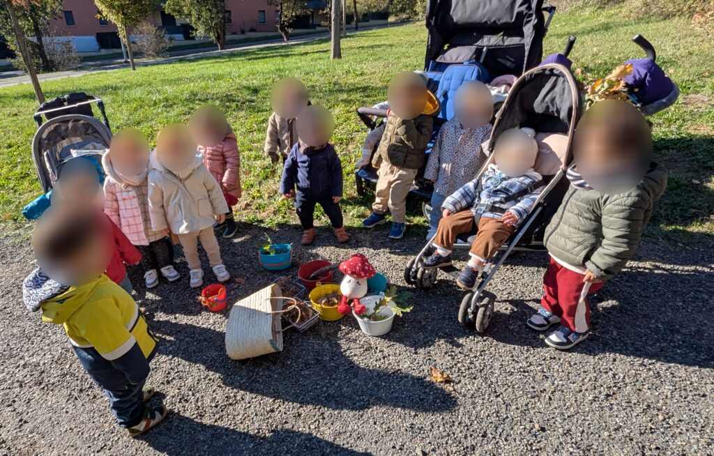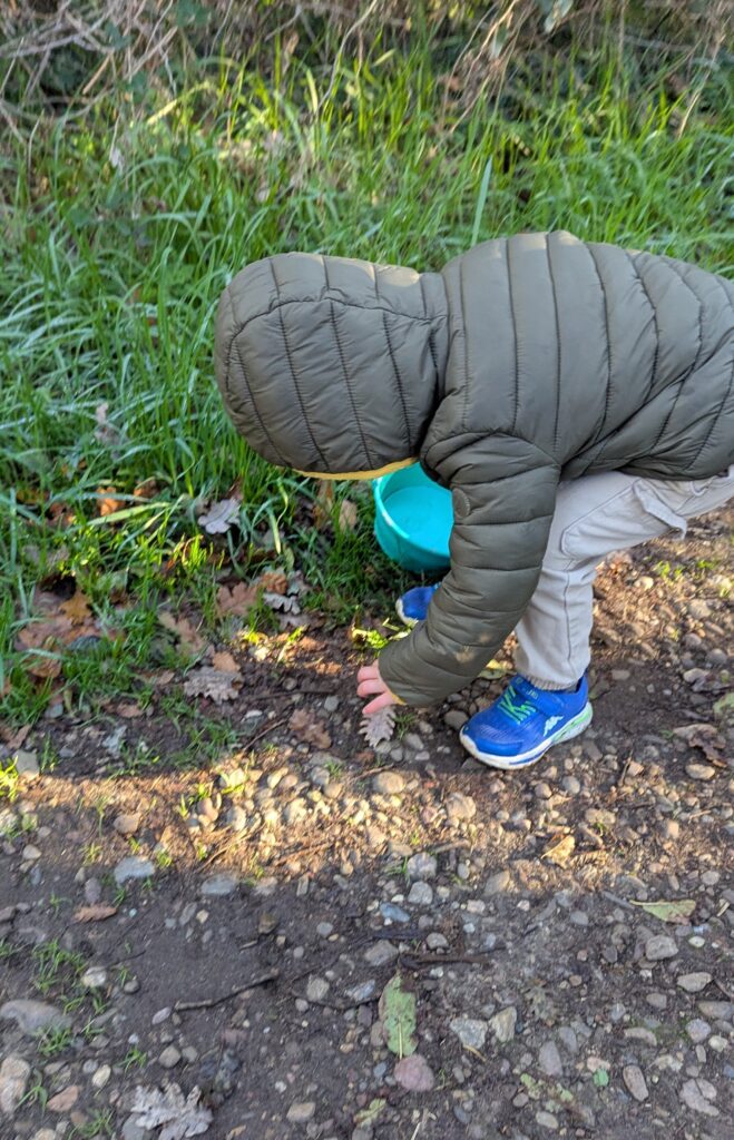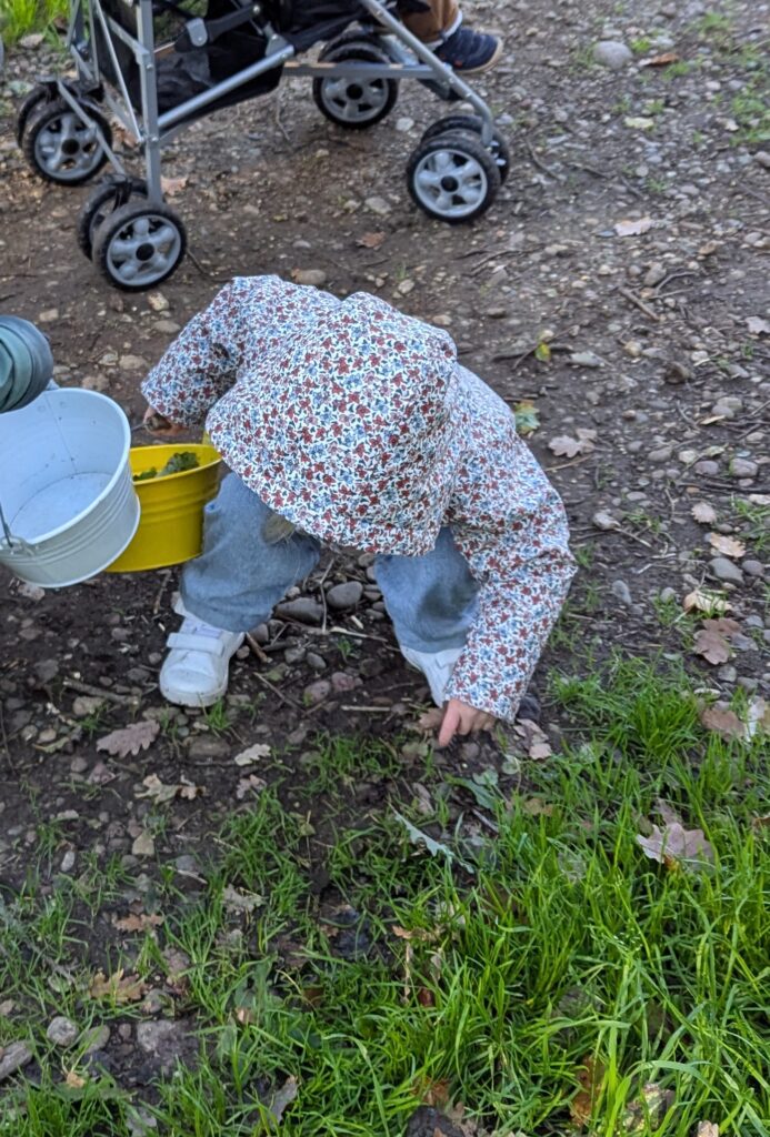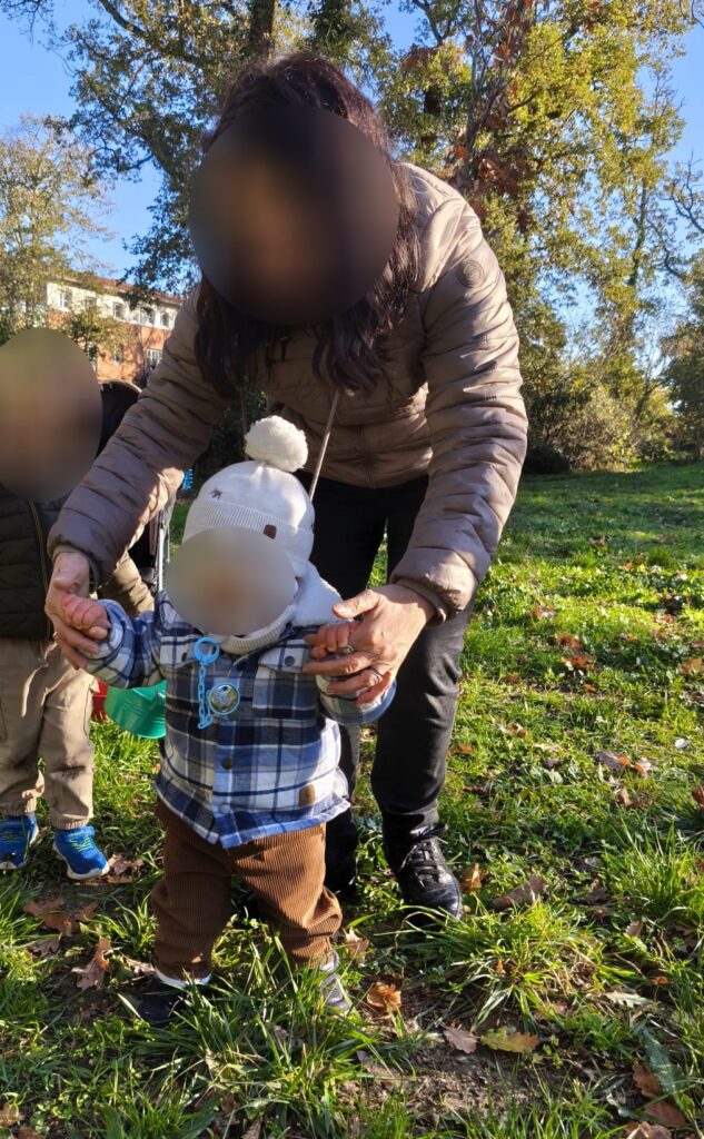 Gabin et Charlie ont fouillé autour des arbres, trouvant feuilles dorées, petites branches, ou encore de magnifique cailloux. Ils ont même partagé quelques trésors avec Jules, qui de son côté a profité de la promenade pour faire quelques pas avec nounou. Chaque découverte était un émerveillement.