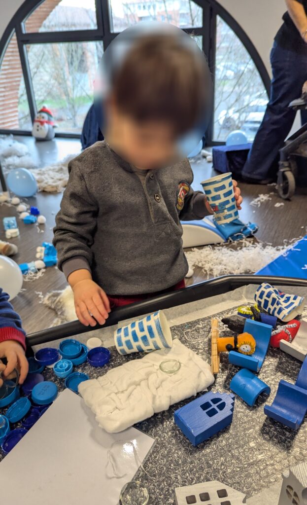 La table sensorielle permettait de manipuler, empiler, construire de petits paysages polaires. Les enfants ont pris le temps d’essayer, de recommencer, de faire tomber… et de rire.