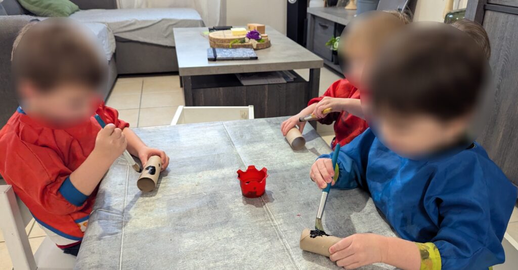 À l’aide d’un rouleau de papier toilette, ils ont peint en noir, laissant libre cours à leur imagination et à leur motricité fine. Pinceaux en main, chacun a pris le temps de peindre.